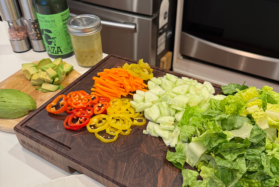 • Wash the romaine heart, cut in half lengthwise, cut the ends off, then chop up the other direction.