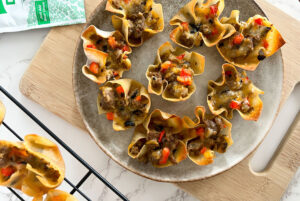 These crispy baked wonton cups are loaded with spicy turkey sausage, melty cheese, and ranch-seasoned goodness. Perfect for game day snacking and football season gatherings. Servings: 30 Prep time: 15