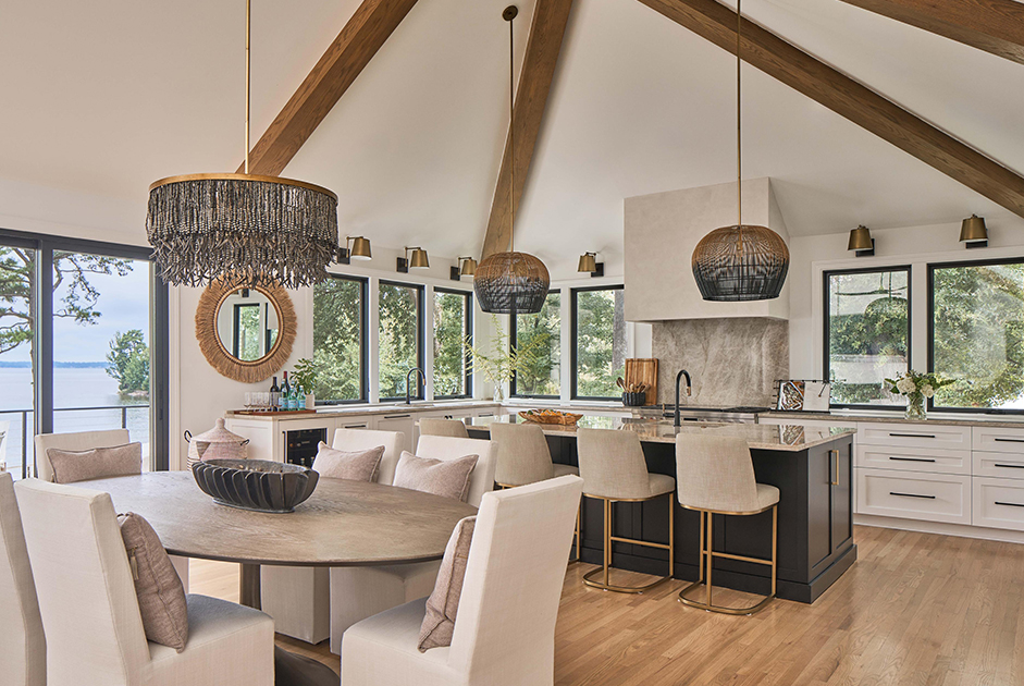 Simonini Homes crafted an expansive, light-filled lakefront kitchen where a grand island, hidden pantry, and dedicated beverage zones support effortless hosting and daily living. Vaulted ceilings, countertop-height windows, and concealed outlets create a seamless, modern aesthetic that gracefully unites the great room, outdoors, and panoramic water views.