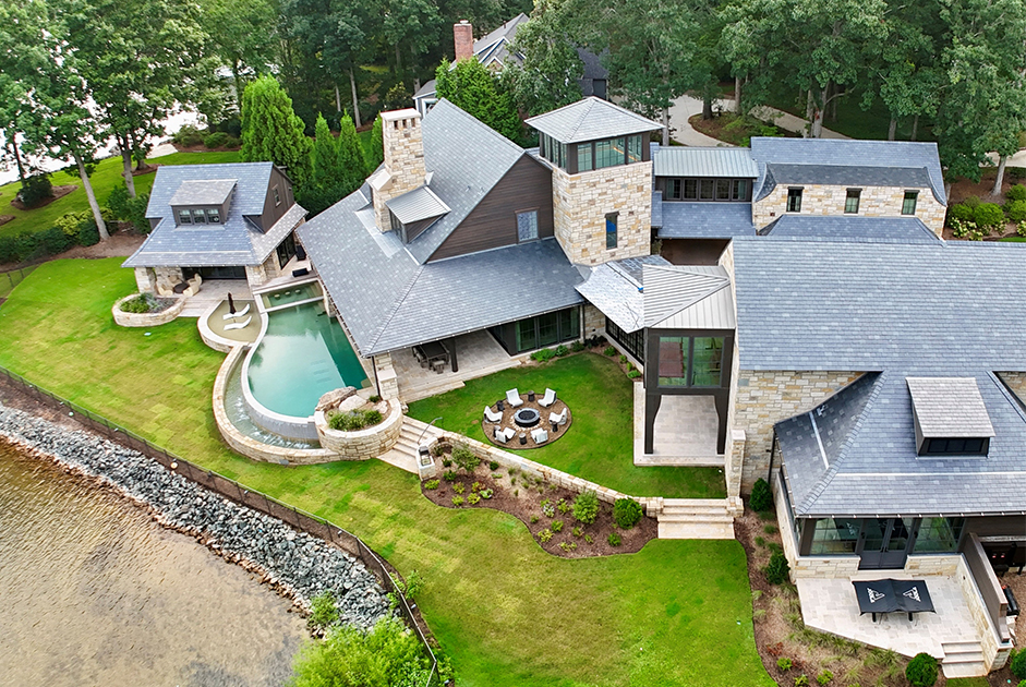 Kingswood Custom Homes created “Lookout Manor,” a striking Lake Norman landmark blending timeless stone craftsmanship with modern living. Hand-laid stone walls, dramatic tower elements, and expansive glass capture sweeping water views. An infinity-edge pool cascading toward the lake, terraced outdoor living, and family-focused design deliver a legacy retreat balancing enduring elegance with lakeside lifestyle.