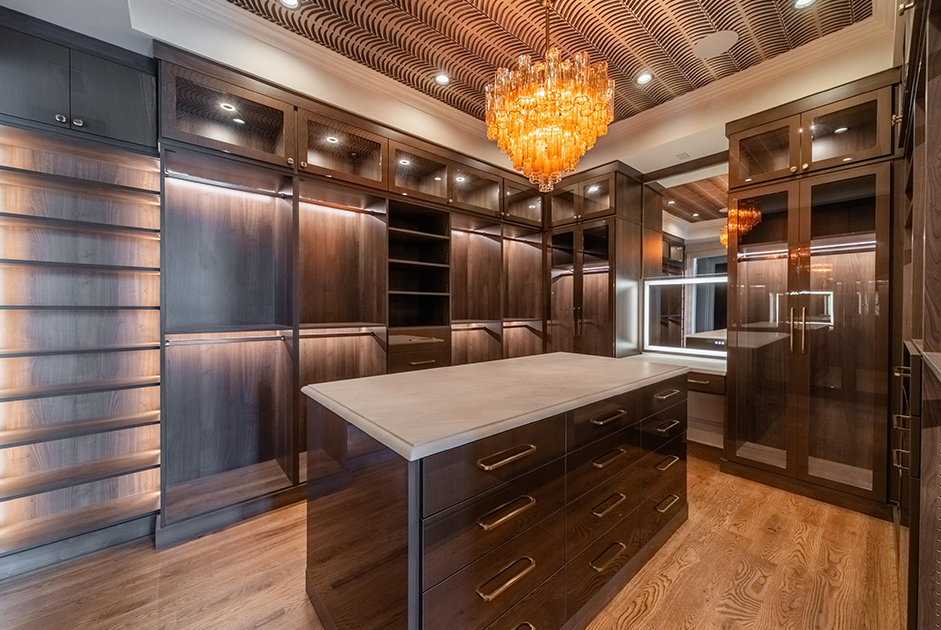 The Closet Niche’s custom boutique-style closet is a glamorous sanctuary of warm bronze hues, floor-to-ceiling acrylic cabinetry, hand-routed LED lighting, and a double island beneath a crystal chandelier. Thoughtfully engineered to the inch, it blends luxury and function into a refined and indulgent space.