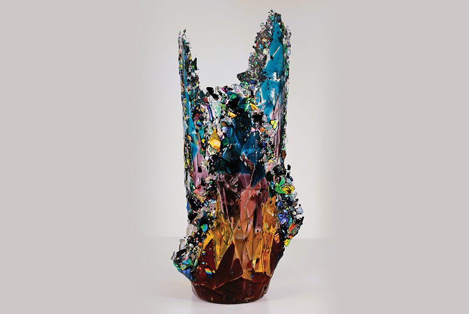 Free-formed with cut and crushed shards of glass, arranged and layered to create their organic shapes, Elijah’s designs blend overlapping colors and thin threads of curled glass.