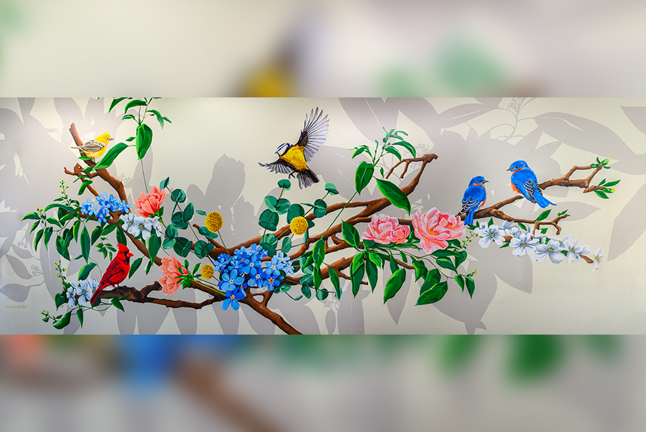 The birds add movement and life – a cardinal symbolizes enduring love and remembrance; two bluebirds represent shared joy; a yellow warbler flits as a messenger of everyday delight; and a blue tit mid-flight encourages courage and transformation – a leap into possibility.