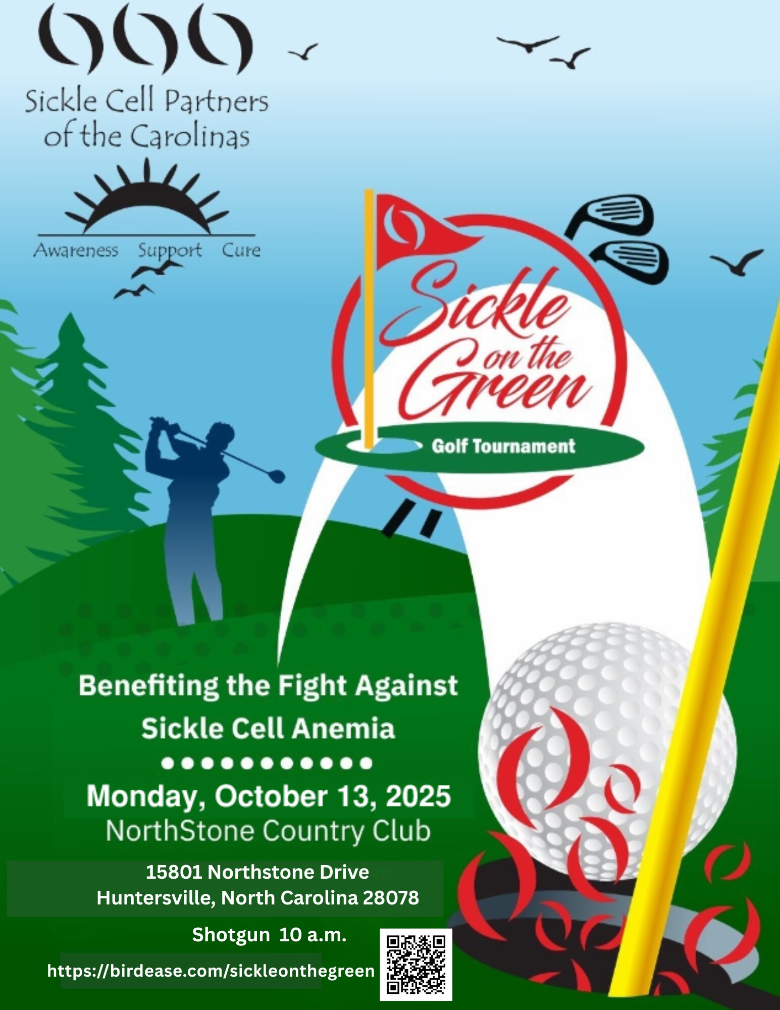 Join us for the 4th annual Sickle on the Green Golf Tournament, benefiting the fight against Sickle Cell Anemia. The golf tournament will take place on Monday, October 13, 2025, at NorthStone Country Club in Huntersville, North Carolina. Gather your team or join one of our existing teams and play a great day of golf for an awesome cause!
