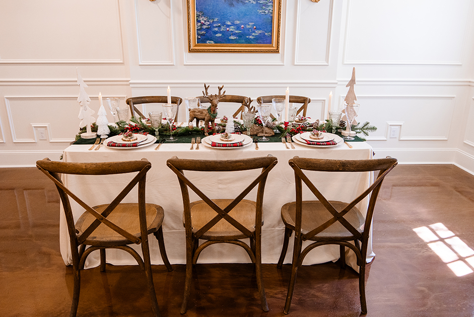 A few examples (pictured) include the classic glistening emerald cloth with a holly runner and vanilla twill napkins, the festive Christmas tiding cloth with matte satin ruby napkins and green carousel goblets, the whimsical Christmas cookies cloth, the Santa toile cloth with velvet hunter napkins – featured with an X-back rustic bar stool, and the always elegant velvet ivory cloth topped with a velvet green runner, plaid taffeta napkins, holiday flameless candles and greenery, and pretty X-back rustic chairs.