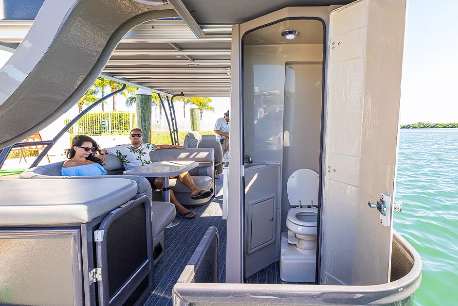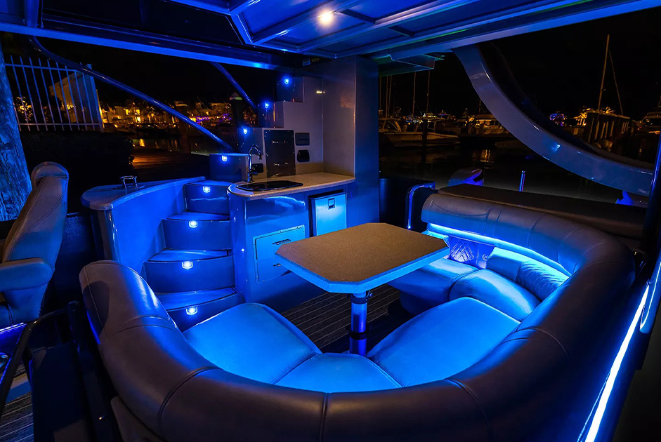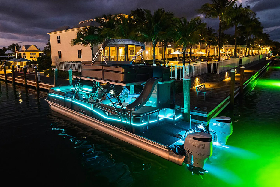 Adding to that unmistakable lake magic this summer, Dustin introduces us to the newest member of the Island Vibes Charter fleet – the Bora Bora! The true pinnacle of sleek sophistication, the beautiful new 35-foot vessel is 10 feet wide with a top speed of 60 mph and built for enjoying lake life to the fullest. This beauty comfortably seats 22 guests, features a galley, full bathroom, upper deck and lower deck, water slide and a stunning ambiance courtesy of amazing LED lights and an incredible sound system.