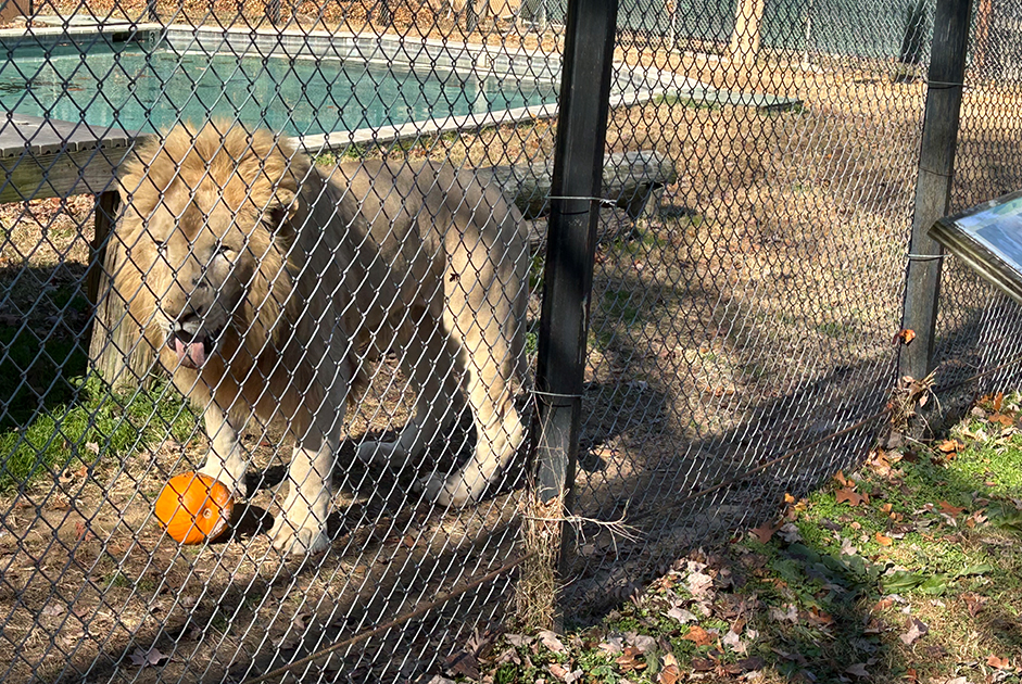 As we moved outside, we couldn’t believe the number of lions they had. Some were individually caged and others were together. We never saw any female lions. What we saw was the lions playing with pumpkins. We later learned they fill the pumpkins with ice cream. They know the way to a lion’s heart.