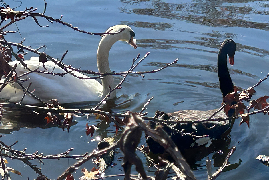 We saw many birds and monkeys as we traveled to the tigers. On the way we noticed a white swan was following us along the bridge we were on. Suddenly, a black swan emerged, extended its neck, and emitted a loud sound. I guess he told the white swan to back off.