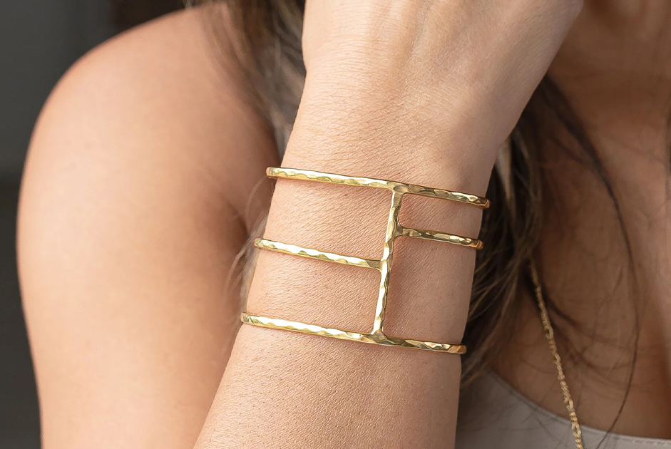Mickey Lynn, a modern classic with quiet confidence. This geometric cuff delivers maximum impact through the simplest of forms. Clean lines and a softly hammered finish create a sculptural silhouette that feels both contemporary and timeless. Lightweight and wearable, it adds just the right amount of boldness whether paired with a cozy knit or your favorite holiday dress. A beautiful choice for the woman
