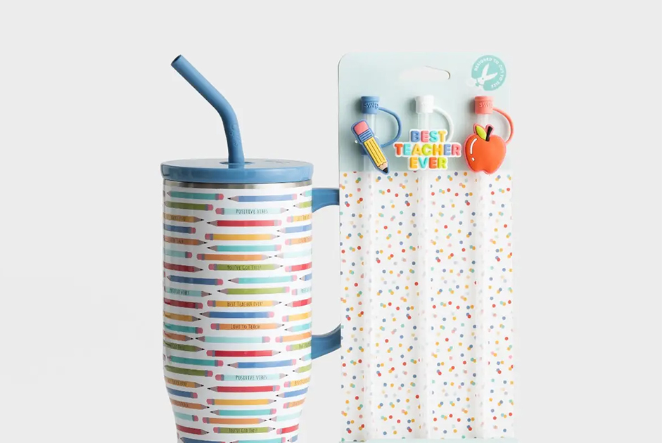 * Teacher Appreciation Week is May 5th through the 9th! Say “thank you” in a big way to your favorite teacher with the colorful SWIG teacher cup and cute straw topper set for the “best teacher ever!”