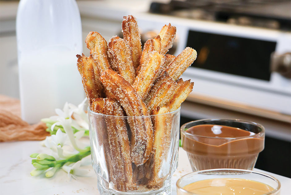 - Transfer the dough to a piping bag with 1” star tip. Pipe 4-5” long churros on a pan lined with parchment paper.