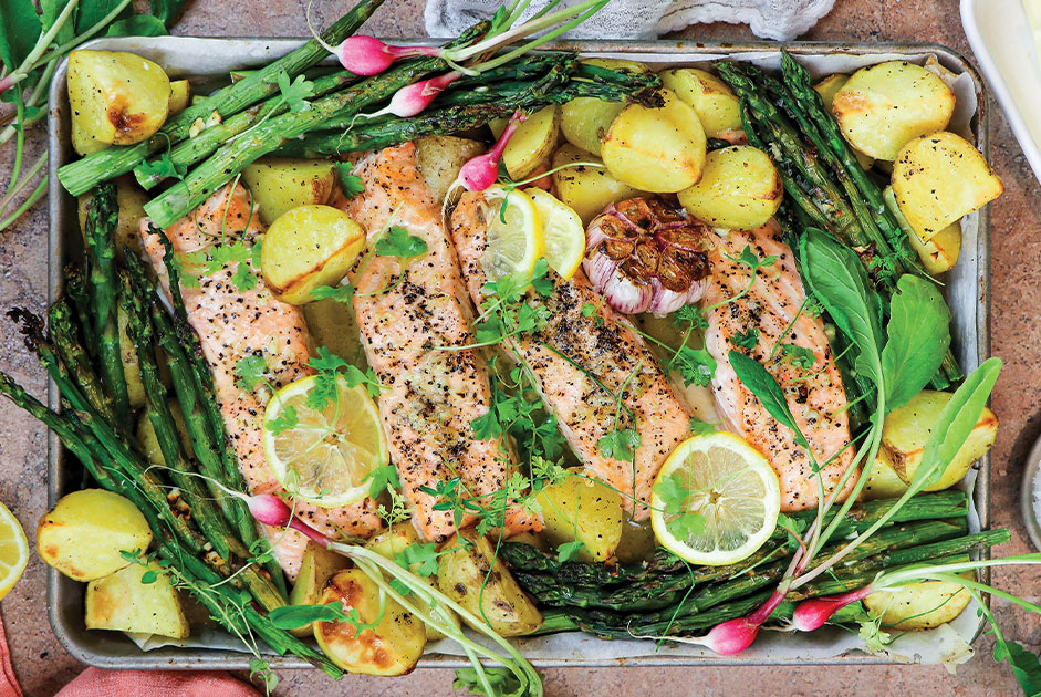 - Push the potatoes to the side of the pan. Add the salmon fillets and asparagus in the center. Season the salmon fillets with salt and black pepper.