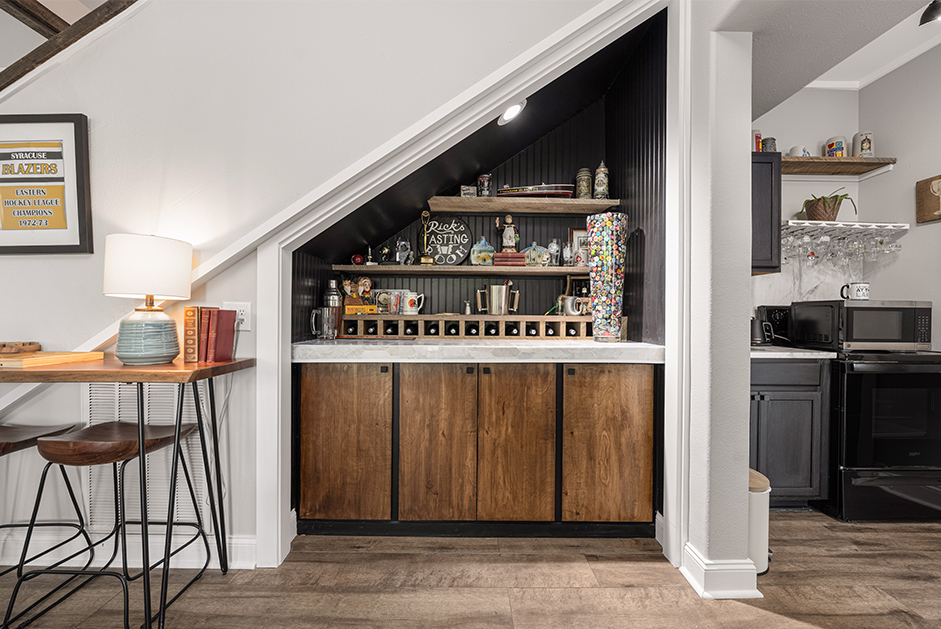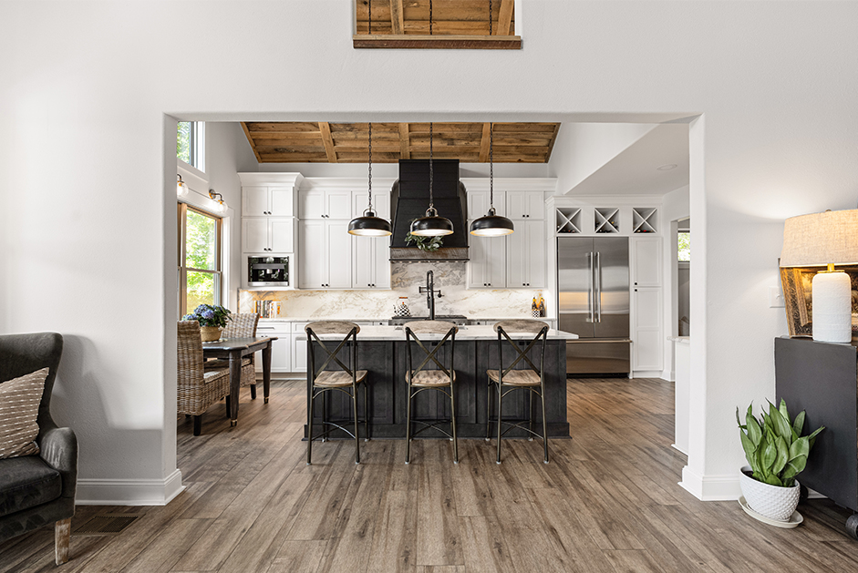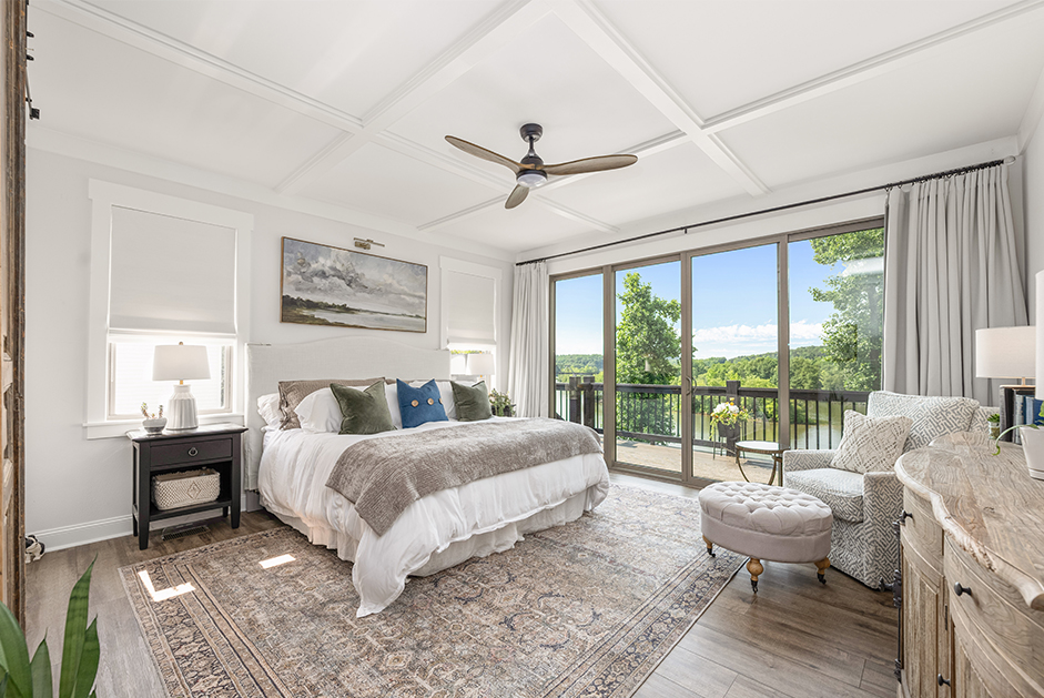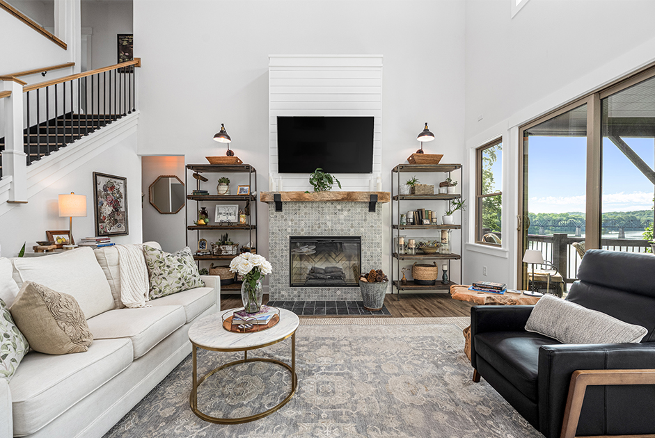“The first thing we did was add 23 additional windows, so we could take in more of the stunning view, and capture the light from the front-facing southern exposure,” she shares. “We removed every piece of flooring, tile and carpet on all three levels, added a deck on the lower lake level the width of the entire home and added a front porch – also the width of the house,” she says.
